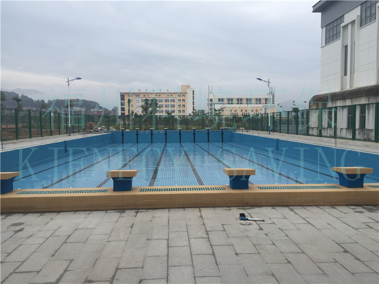 標準游泳池長50米,寬21米,奧運會世界錦標賽要求寬25米,另外還有長度只有一半即25米的游泳池稱為短池。水深大于1.8米。有8個泳道,每道寬2.5米,邊道另加0.5米,兩泳道間有分道線,分道線用浮標線分掛在池壁兩端,池壁內設掛線勾,池底和池端壁應設泳道中心線,為深色標志線。出發臺應居中設在每泳道中心線上,臺面50厘米×50厘米。臺面臨水面前緣應高出水面50至70厘米,臺面傾向水面不應超過10度。游泳池的池岸寬一般出發臺端不小于5米,其余池岸不小于3米。正式比賽池,出發臺池岸寬不小于10米,其他岸寬不小于5米。